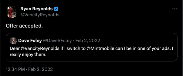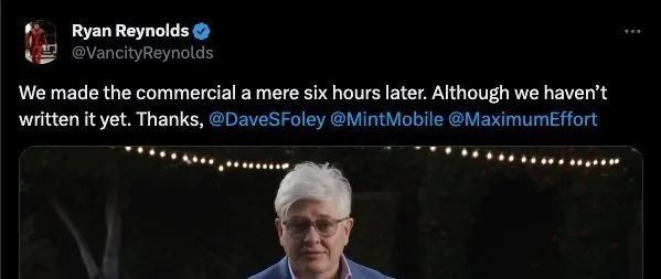 On my third day at Maximum Effort, Canadian comedian Dave Foley randomly tweeted at Ryan Reynolds asking if he could be in a commercial if he switched to Mint. Ryan, a fellow Canadian, responded with a yes. So, we wrote, shot, edited, and posted the ad in under 20 hours. And now, much like Dave, I also have grey hair.